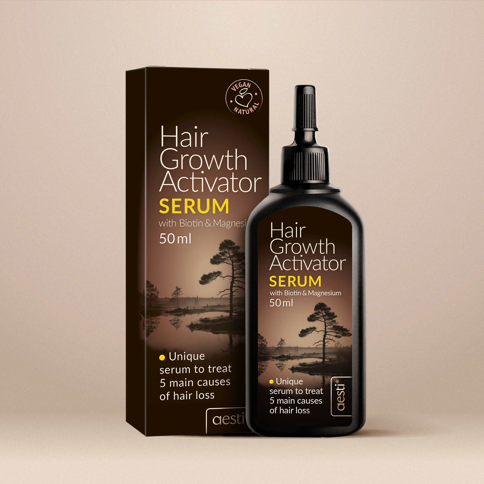 Aesti hair growth serum stimulates hair follicles, reduces hair loss, and activates new hair growth. Its natural formula with Biotin, Magnesium, and plant extracts nourishes the scalp, balances the microbiome, and improves nutrient absorption into the hair roots.