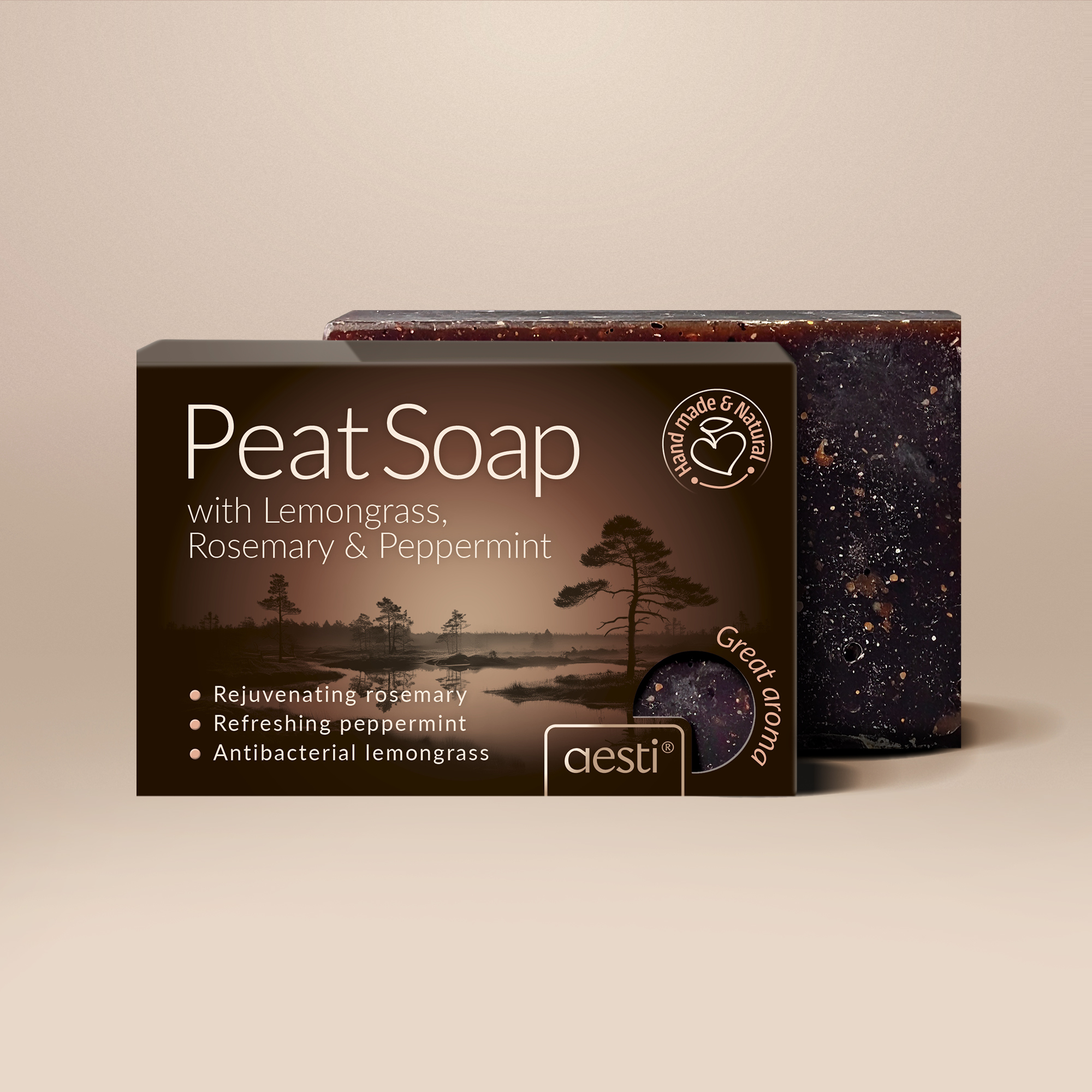 Aesti Organic Peat Soap combines the purifying properties of Estonian bog peat with the refreshing essence of lemongrass and the cooling effect of peppermint. Peat gently cleanses the skin by removing impurities and excess oil, while nourishing and balancing it at the same time. Lemongrass stimulates circulation and leaves the skin feeling fresh and revitalised, while peppermint soothes and refreshes with a pleasantly cooling sensation.