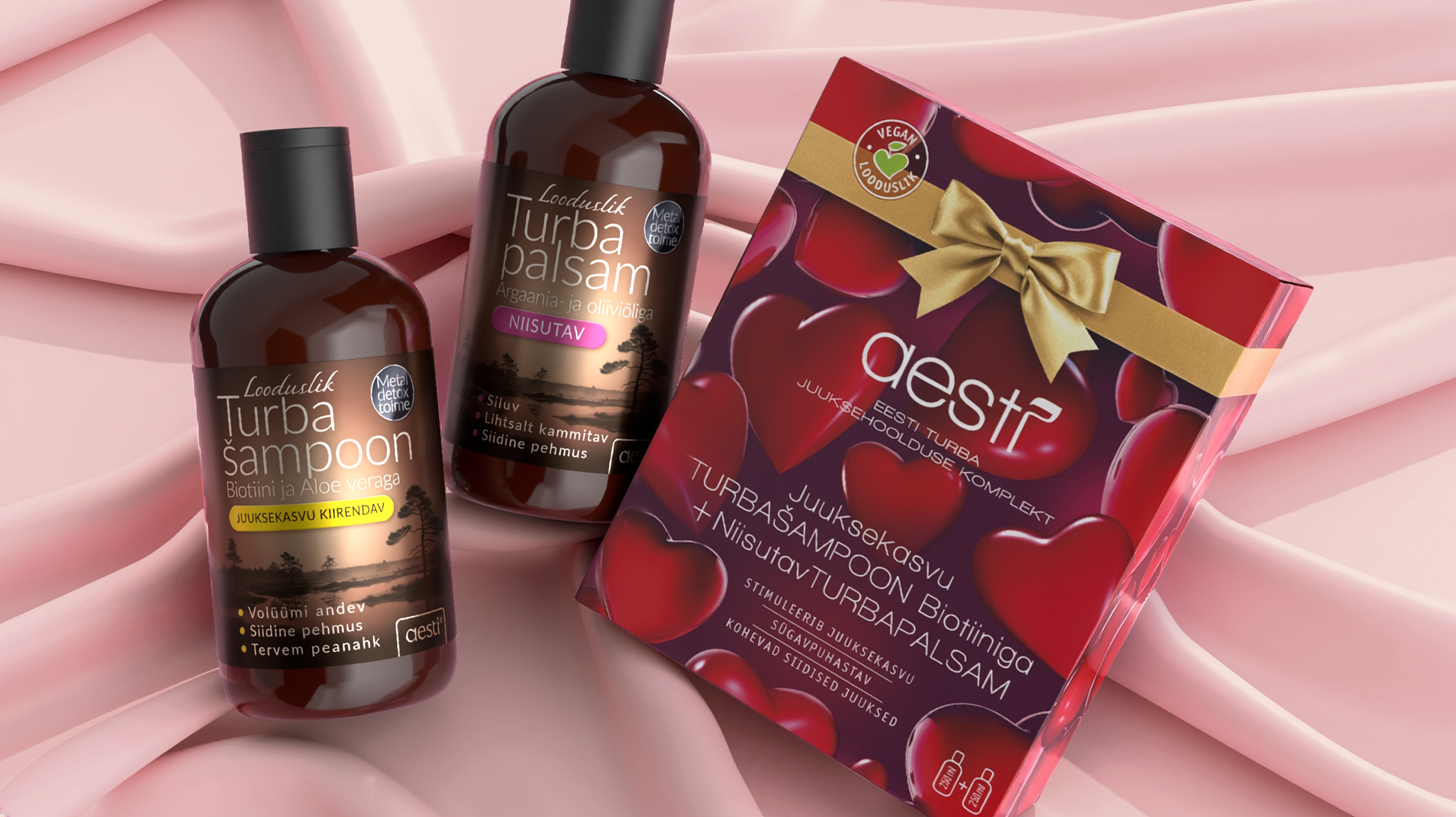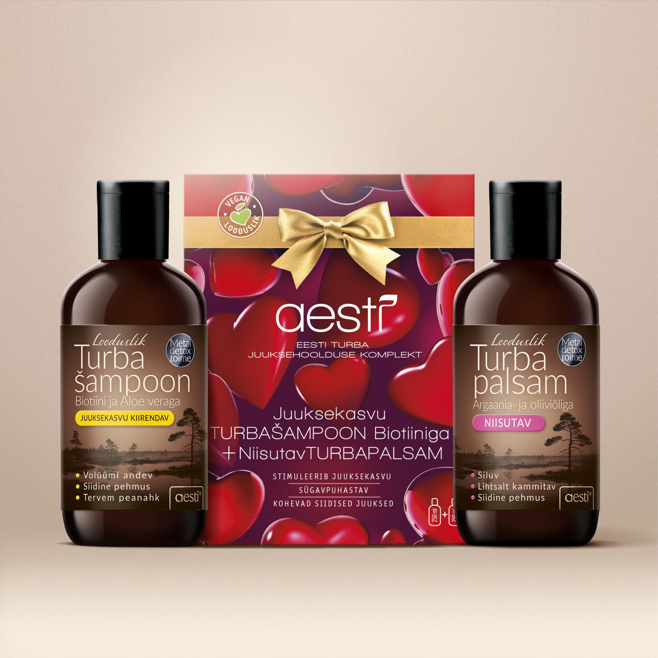 Armastuse Pai kinkekomplekt ühendab kaks Aesti enimmüüdud toodet – juuksekasvu turbašampooni biotiiniga ja niisutava turbapalsami. Šampoon toetab juuste loomulikku kasvu, puhastab õrnalt ning varustab peanahka mineraalide ja toitainetega. Palsam toidab ja niisutab sügavuti, muutes juuksed pehmeks, siledaks ja kergesti kammitavaks.