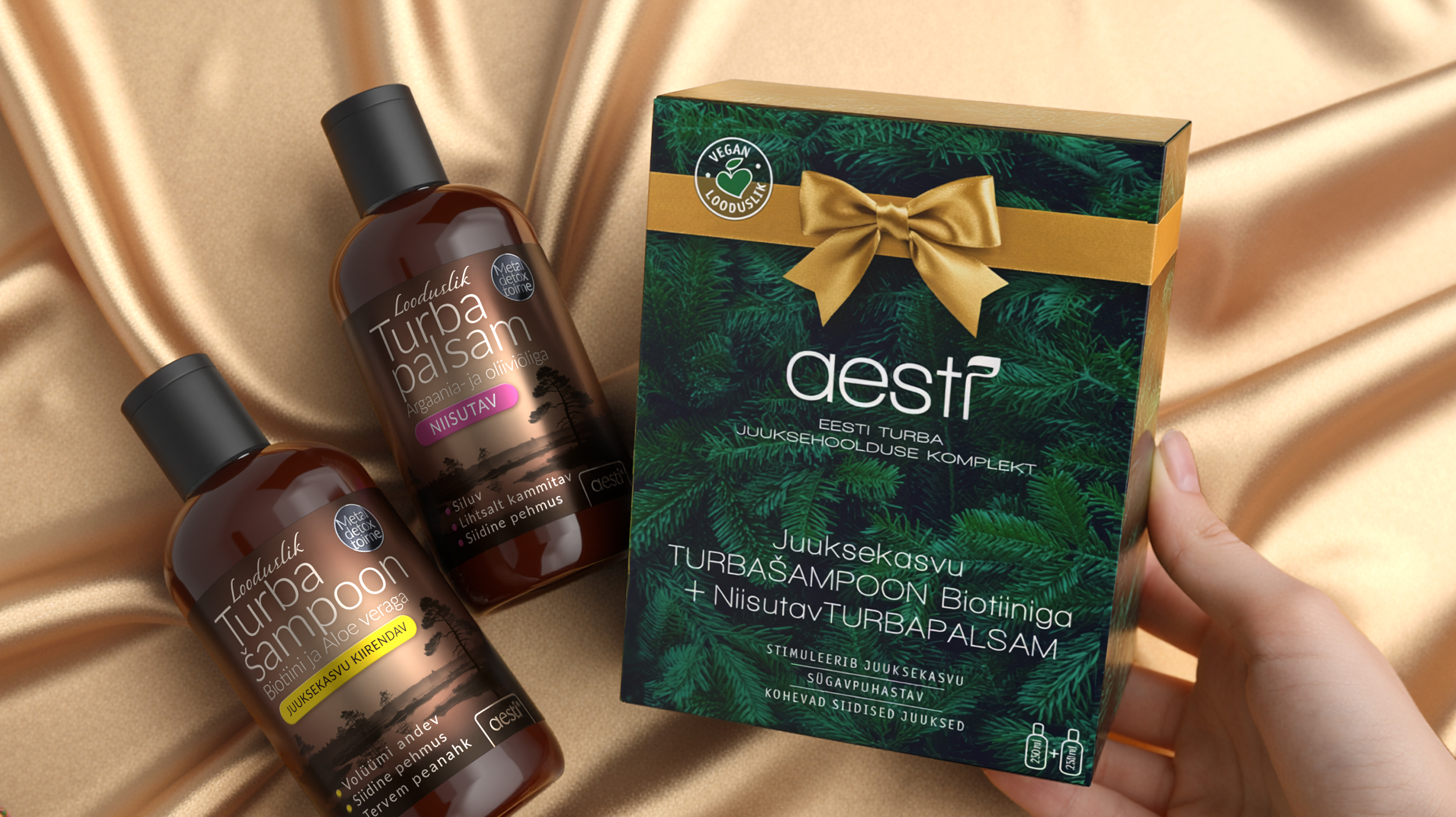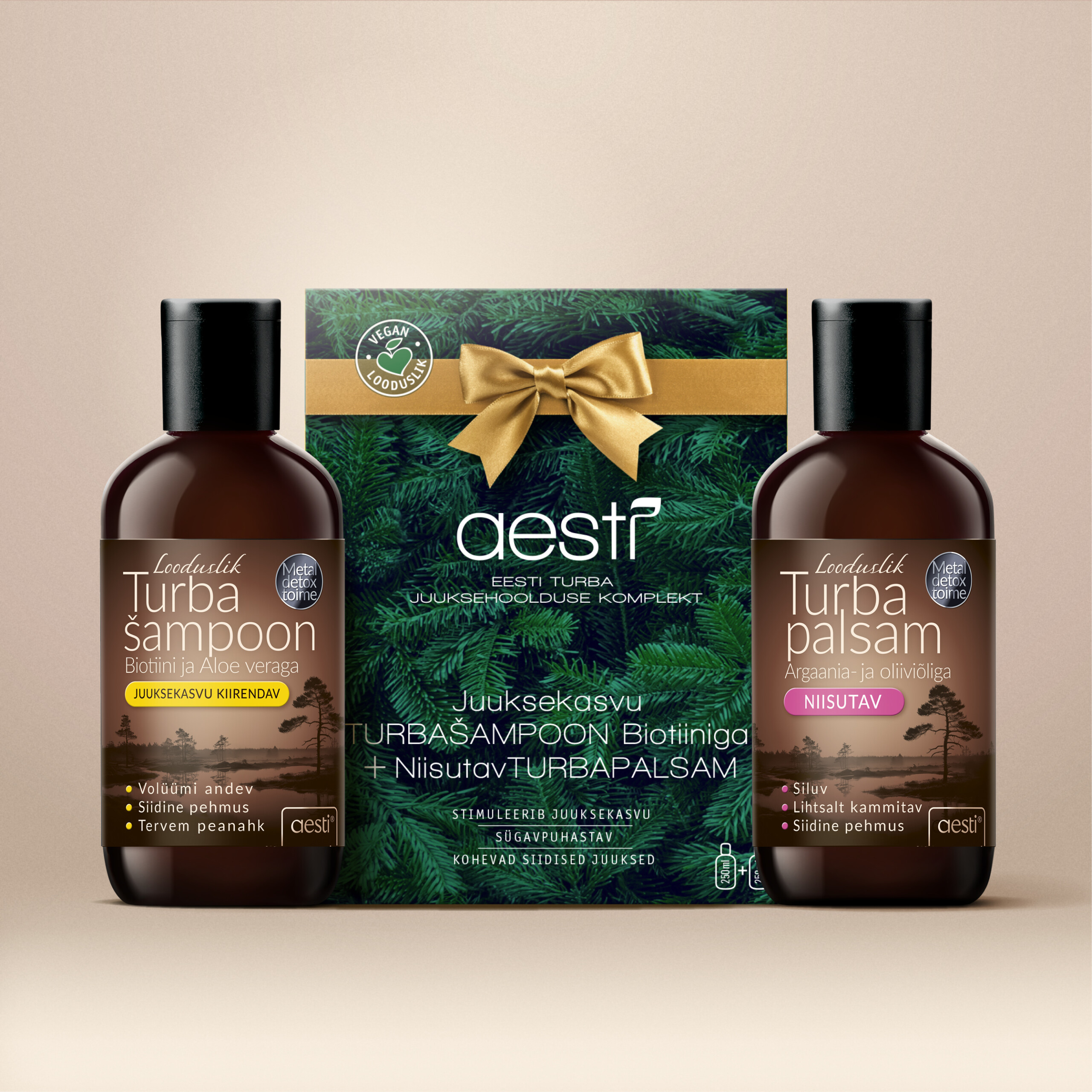 Looduse Pai kinkekomplekt ühendab kaks Aesti enimmüüdud toodet – juuksekasvu turbašampooni biotiiniga ja niisutava turbapalsami. Šampoon toetab juuste loomulikku kasvu, puhastab õrnalt ning varustab peanahka mineraalide ja toitainetega. Palsam toidab ja niisutab sügavuti, muutes juuksed pehmeks, siledaks ja kergesti kammitavaks.
